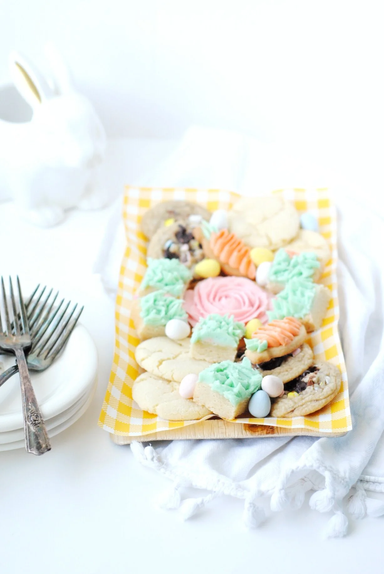 Assortment of cookies—four Cadbury chocolate chip, four lemon cookies , one flower sugar cookie, two mini carrot sugar cookies, six sugar cookie buttercream bars and Cadbury egg filler. Comes on a bamboo tray ready to serve at your Easter egg hunt or any Easter gathering. (Serves ~18)